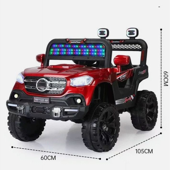• Eye-Catching Design: This jeep boasts a sleek and stylish design with realistic details like front screen lights, back frame/grill lights, and headlights.